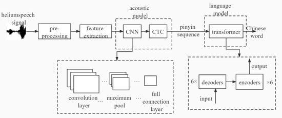 Firstly, the helium speech signal is preprocessed to reduce the influence of background noise on the system, and the helium speech signal is converted from the time domain to the frequency domain. Then, appropriate representative features are extracted from the helium speech signals, which are used as the input of the acoustic model. The output consists of all possible pinyin sequences corresponding to the features and acoustic model scores. Here, all pinyin sequences refer to pinyin sequences with the same pronunciation but different text. Finally, the dictionary maps the pinyin sequence to the word sequence, and the language model estimates the probability of these sequences and generates a corresponding language model score, taking the word sequence with the highest score as the final recognition result.