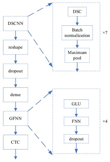In real scenarios, communication between divers and people on land contains many rounds of conversation, and the last sentence can provide useful information for the current sentence. In speech recognition, this information is called context sensitivity. In a model comprised of a CNN, CTC and a transformer, there are a total of 1.7 million parameters. The number of training and testing parameters and the time costs of the network are huge. To reduce the number of parameters, the proposed unscrambling algorithm should be optimized. The proposed optimization algorithm combines DSC, a GLU and an FNN to model context sensitivity, as shown in Figure 2.