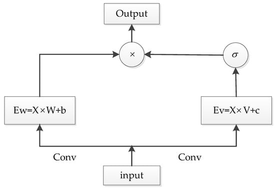 A GLU can be regarded as a CNN network that can process sequential data in parallel. It only has output gates, which can control the output based on the sequential information’s location. The architecture of the GLU is shown in Figure 4, and the expression is as follows: