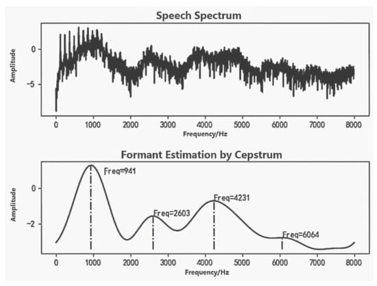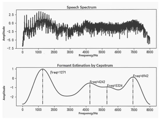 Further, we recorded the vowel "a" in the same way and compared the formant frequency of this with that in normal environments, as shown in Figure 5 and Figure 6. The formant information was obtained using a cepstrum []. The first four formant frequencies of normal speech were 941 Hz, 2603 Hz, 4231 Hz and 6064 Hz, as shown in Figure 5, and the first four formant frequencies of helium speech were 1271 Hz, 4242 Hz, 5324 Hz and 6942 Hz, as shown in Figure 6. The speech following the inhalation of helium gas showed an increase in formant frequency and variation in bandwidth compared with normal speech. This is consistent with typical features of helium speech. Therefore, it is feasible to use helium speech at atmospheric pressure instead of helium speech at high pressure for preliminary research.