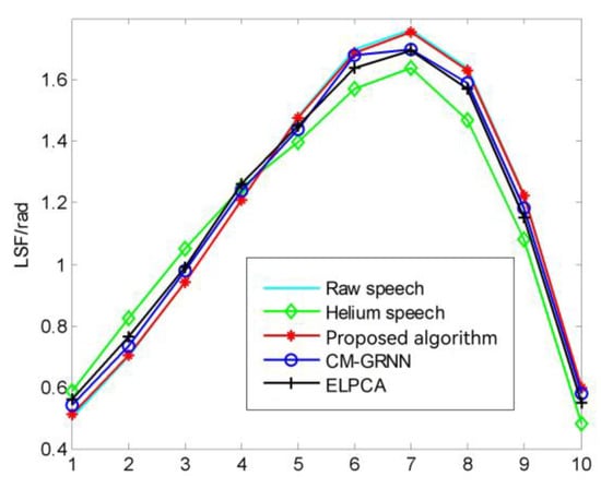 Figure 8 provides a comparison of the LSF performance of different algorithms. We plotted 10 LSF values. These show that the LSF of speech corrected by algorithm ⑤ is almost the same as that of raw speech. There are some errors between the raw speech and speech corrected by the CM-GRNN algorithm or the ELPCA algorithm. This suggests that algorithm ⑤ can correct the distortions of helium speech more effectively than the CM-GRNN and ELPCA algorithms.
