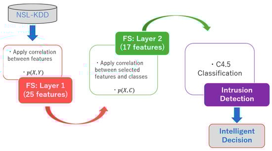 The work [57] proposed a three-layer model (NID) for intrusion detection as shown in Figure 1. Layer (1): analyze the correlation of 41 features (DS. NSL-KDD) and select the features that meet the requirements (PCC > 0.1). Layer (2): correlation analysis is performed between the selected features and classes to further reduce the number of features. Layer (3): evaluate the performance of linear correlation-based FS on C4.5 classifier. The C4.5 classifier divides NSL-KDD into five kinds of output: normal and four kinds of attack. The limitation of this scheme is that although it achieves the elimination of redundant features and irrelevant features, there is no clear description on the specific implementation method, and there are some places that may be wrongly expressed.