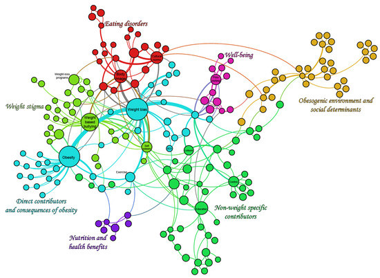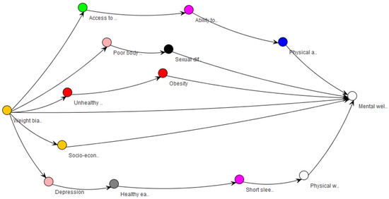 - An exploration tool (Figure 4) to interactively visualize the factors and their relationships. For example, one may ask “my work is on weight stigma, how does it relate to other parts? What increases stigma?”;
