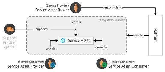 The construct that connects the players in a digital ecosystem is called a digital ecosystem service. At its core, this service is a brokering service that is centered around an asset. An asset can be a physical item, such as a used item on eBay, a service, such as an accommodation on Airbnb, or a digital asset, such as music on Spotify. The role that provides the brokering service is called an asset broker. This role is not only responsible for the brokering itself but also for providing the means for onboarding the two additional focal roles in a digital ecosystem service: the providers and the consumers of the asset. An asset provider places their assets such that they can be found and accessed, after a potential transaction, by asset consumers. Beyond these roles, additional players can contribute to an ecosystem service. To distinguish them from the core roles, they are called support providers. Support providers can take over any additional responsibility for the provision of an ecosystem service. For example, they can perform fulfillment activities, which are particularly relevant in the case of physical assets; for example, the goods sold at eBay are delivered by parcel delivery services acting as support providers.