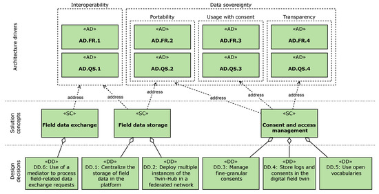 In this paper, we present eight architecture drivers, six design decisions, and three solution concepts for a reference architecture of a digital platform aimed at addressing these qualities. This work extends our previous paper on the topic [9]: In the previous paper, we had a specific focus on the usage of certain technology (asset administration shells, the so-called “Industry 4.0 digital twins”) to address interoperability in agriculture. Back then, one architecture driver and two design decisions were introduced (The architecture driver AD.QS.1 was introduced in the previous paper as “AP.IOP.2”. The design decisions DD.1 and DD.6 have their parallels in the design decisions ‘DD.2” and “DD.3” of the previous paper, even though they are not exactly the same, for the focus of the previous paper was different.). The reference architecture was created in the context of the research project Cognitive Agriculture (COGNAC) (https://cognitive-agriculture.de (accessed on 17 March 2023).), where we explored applied solutions in field automation, novel sensing, smart devices, and digital data spaces.