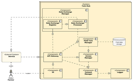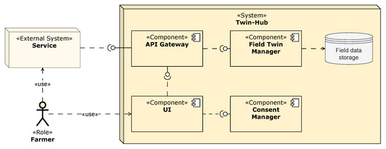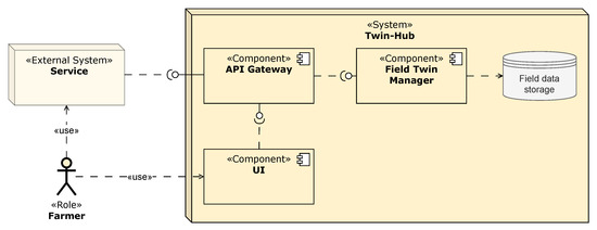 The Twin-Hub has a component called Field Twin Manager, which is responsible for the storage and retrieval of field data. In many cases, field data are static—i.e., they do not change or take too much time to change (e.g., the field boundaries), but there are cases where field data can be quite dynamic (e.g., soil humidity and weather conditions). In such cases, the Field Twin Manager will favor live calls to external services that can provide the latest data and keep a local cache just in case the external service providers are unavailable. Figure 4 shows an initial decomposition of the platform components (further decomposition will be revealed along with a further description of the solution concepts). The Twin-Hub has a user interface (UI) component, which provides the farmer with the means to manage their field twins, and an API Gateway component, which exposes functions for interacting with the platform.