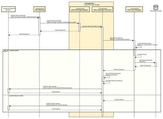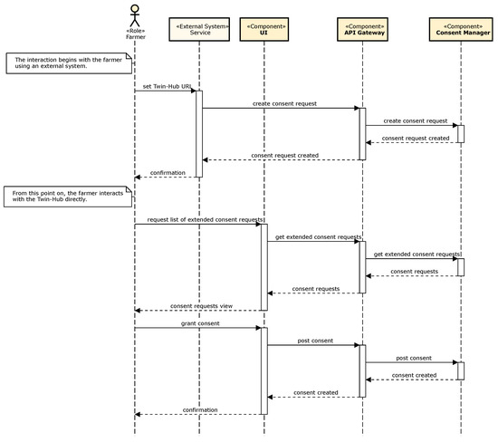 Farmers manage their consent requests through the UI of their Twin-Hubs. If the farmer has triggered the creation of a consent request, they should notice the request in their Twin-Hubs and can then decide whether to approve or decline it. The acceptance of a consent request creates a consent, which grants specific access and usage rights to the service that requested it. The consent contains two levels. The first level is given by the consent request (i.e., the specific field data, the type of access, and the data usage statement). The second level provides information on the fields for which the farmer wants to accept the consent request, as the farmer may have several fields but may want to grant a particular service access to only a subset of their fields. Figure 6 increments the initial functional decomposition by adding the component Consent Manager. Figure 7 illustrates the process from the creation of a consent request to its acceptance by the farmer in a sequence diagram. The consents given by the farmer to the use of the field data of a certain field are stored in the corresponding digital field twin (DD.4).