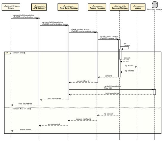 Once consent is granted, the corresponding service can interact with the Twin-Hub to create, read, update, and/or delete the specific field data from the specific digital field twins to which they have been granted access. Every time the service reaches the Twin-Hub to access a digital field twin, another Twin-Hub component steps in the Access Manager. It is responsible for checking whether the requester has been granted access to perform the requested operation. For example, if a service requests the reading of the field boundaries of a particular field of a farmer, the Access Manager checks whether there is valid consent that grants access to this operation. Furthermore, anytime the Access Manager allows a service to access a digital field twin, it creates a log entry in the digital field twin containing the timestamp of the operation, the service performing the operation, the user who granted the access, the field, and specific field data, and the operation type. Figure 8 increments the system decomposition by adding the components Access Manager and Logger. Figure 9 illustrates the access control and logging process. Similar to the consents, all field data access logs are stored in the corresponding digital field twin (DD.4).