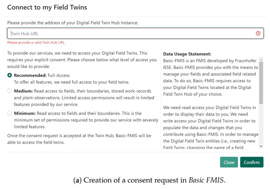 The Twin-Hub implements a Consent Manager component, which is responsible for managing the consents given by farmers to external services interested in their field data. When an external service needs access to field data, the service has to ask the farmer, who is the data owner, for access. For this purpose, the service creates a data access and usage consent request. The two core pieces of information included in the request are the specific field data the service is interested in (e.g., “field boundaries” or “current nitrogen level”) and the data usage statement. The former will tell the farmer which fine-granular data they will be granting access to (DD.3) and which type of access (namely: read, create, update, or delete); the latter carries textual information about how the data will be used and for which purpose—information that the farmer will take into consideration to decide whether they will accept or decline the consent request. Since there will be a federated network of Twin-Hubs, the farmer must tell the service the address (URL) of the Twin-Hub that hosts their digital field twins. Then the service is able to send the request to the proper host.