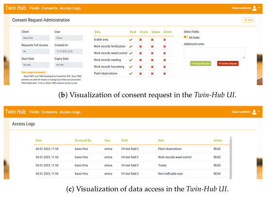 Twin-Hub UI, Consent Management, and Access Management. The prototype includes a UI through which the farmer can currently manage their digital field twins; accept (or decline) consent requests; visualize (and revoke) granted consents; and visualize the access log. Figure 13 shows excerpts of a service and the Twin-Hub UI to illustrate the user journey from the creation of a consent request to its acceptance and access visualization.