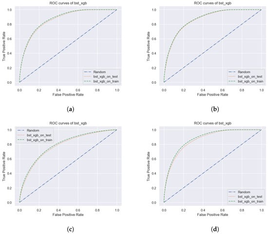 ROC Curves of the XGBoost models based on different features selection techniques. (a) UFS-XGBoost. (b) FIDT-XGBoost. (c) RFE-XGBoost. (d) IV-XGBoost.