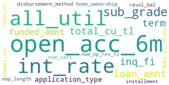 The literature offers a variety of feature selection approaches and techniques including univariate selection [6], recursive feature elimination [7], feature importance determination using a classification technique, such as decision trees [8], and information value [9], among others. The objective of this paper is to find the most relevant/important features to refer to in the credit risk assessment problem. We apply, firstly, different feature selection techniques on a real dataset [10], namely the UFS, RFE, FIDT, and the IV to generate their respective training and test sets. Then, we fit an XGBoost model [11] for each dataset. The performance of the obtained classifiers is compared using different metrics, such as F1, accuracy, recall, precision, and the ROC (receiver operating characteristics)–AUC (area under the curve) curves. As the aim of the paper is to find the most relevant features, we build the wordcloud and list the most important nine features used by each selector. It is worth noting that prior knowledge of the determinant of the type of customer will help the financial analyst in taking and justifying the decision on whether to approve or decline a loan request. Additionally, if a classification model has to be developed to classify the customers of the bank, then the use of the minimum relevant features in fitting the model will reduce the curse of dimensionality of the model, the training time, and the overfitting from one side. It will also improve the model’s accuracy and effectiveness by reducing the noise induced by the use of irrelevant features from another side.
