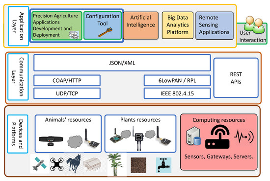 The proposed system model for precision agriculture comprises three main layers, as shown in Figure 1: devices and platforms, communication layers, and application layers.