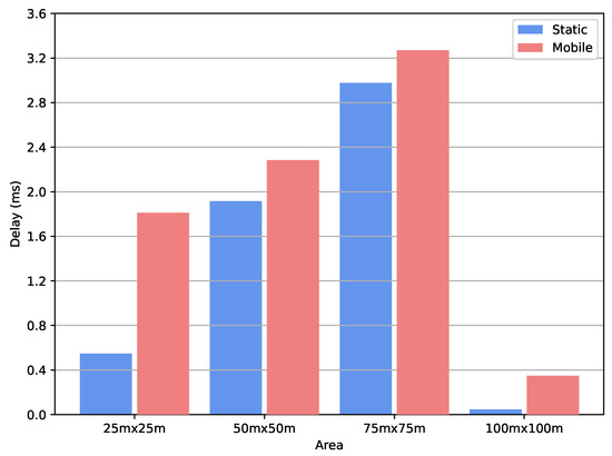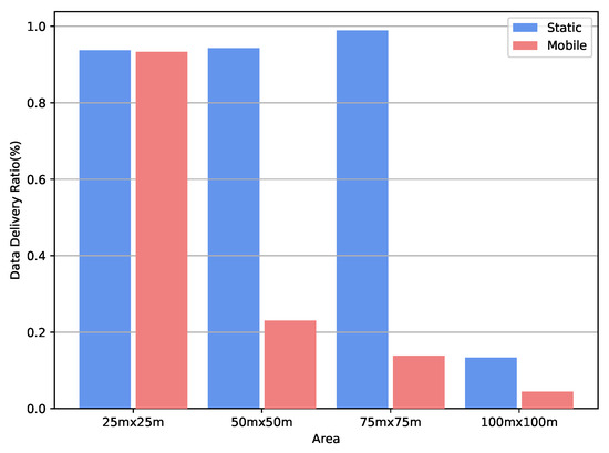 Figure 6 shows the average PDR for different cases. PDR in the static case is always higher than the PDR in the mobile case for different simulation areas. Here, PDR increases while moving from the dense network to a less dense network when the congestion level decreases. Further, the PDR is worse for a spare network (. There are no path details from all nodes to the sink, and some nodes become isolated because of the poor graph connectivity, and the poor PDR for mobile nodes and compared to static nodes result from the frequent changes in the network topology with mobile nodes. The RPL route reconfiguration cannot cope with the fast network topology changes that result in connectivity loss and, therefore, the failure in the delivery of the data when mobile sensor nodes move out of the transmission range of the parent nodes.