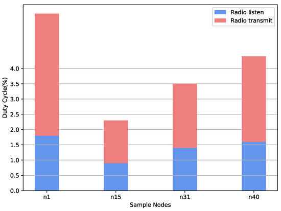 As shown in Figure 8, the red values represent the percentage of time for which the node stayed in the listening mode and listened to the radio messages exchanged by the other nodes. The average listening percentage is approximately 1.75%. The blue values indicate the percentage of time the node stayed in transmission mode, i.e., when the node sent packets to other nodes. The average transmission rate was approximately 2.5%. The network graph represents links between the sender and sinks nodes, as shown in Table 5.