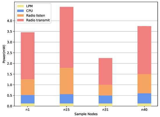 In Figure 9, each bar on the Y-axis indicates the average total power composite of the four power elements (LPM, CPU, radio listen, and radio transmit). The link power management (LPM) represents low power, equal to 0.1 mW. The CPU computer programming unit was 0.85 mW, whereas the average radio listening power was 2.75 mW. Further, the average radio transmission power was 3 mW.