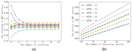 We use the gradient descent method to find the optimal strategy for the MEC servers. Figure 2a shows how to find the optimal resource pricing in the algorithm. Each MEC server decides the resource pricing based on its current network environment and the number of requesting vehicles. As the number of iterations increases, the prices set by MEC servers gradually approximate their own optimal strategies. It is seen from Figure 2a that the proposed algorithm converges to the optimal value. It indicates that each MEC server is able to find its optimal resource pricing for maximizing its revenue.