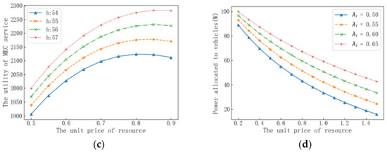 Lastly, we investigate the effect of the MEC server’s resource pricing on the transmit power of the requesting vehicle. The results are shown in Figure 2d. While the resource price gradually increases, the requested transmit power decreases. It indicates that a high resource price incurs a low computing resource allocation. As users attach importance to energy consumption, more computing tasks would be offloaded to the MEC server. Such behavior is aimed to reduce its own energy consumption.
