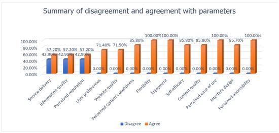 The sum calculation of disagreement and agreement regarding the parameter results from experts in the second iteration of the Delphi method shows that 3 parameters (service delivery, information quality and perceived reputation) received the lowest score on the Likert scale from experts, while 10 parameters (user preferences, website quality, perceived system’s usefulness, flexibility, enjoyment, self-efficacy, content quality, perceived ease of use, interface design and perceived accessibility) had a mean value of 3.5 and above, as shown in Figure 2.