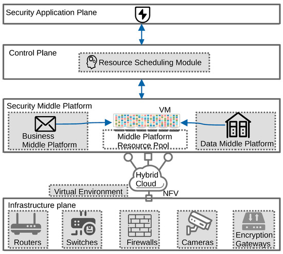 Security middle platform (Smp) resources provide protection capabilities for security operations through security services. Virtualized Smp is deployed in the public cloud to maximize the benefits of a cloud-based, software-defined security middle platform (SDSmp). Smp resources are encapsulated in virtual machines (VMs) using IaaS, PaaS, and SaaS technology models. In the SDSmp job-scheduling model, Smp resources, which correspond to clusters of virtual machines (VMs), are the logical execution units. The actual physical execution unit is the specific infrastructure plane security appliance. The infrastructure plane is functionally mapped to different VM clusters through NFV technology and cloud computing [] to achieve logical device independence.