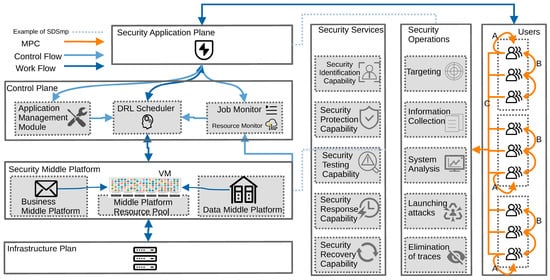 The control plane of MPC-SDSmp is with the security application plane on the north side and the security middle plane on the south side. The optimization architecture is shown in Figure 2, with three arrows to distinguish between the control information and the actual working information during transmission, and the MPC process before the security application plane is connected to the control plane. A dashed line indicates a specific example of an Smp. The MPC-SDSmp cost optimization architecture consists of users, a security application plane, a control plane, a security middle platform (Smp), and an infrastructure plane. The critical part of the control plane for scheduling is the DRL scheduler of the resource scheduling module. Other key components, such as job queues, application management modules, and information collectors, include resource and job monitors that collect information about Smp resources and foreground jobs in the middle platform resource pool.