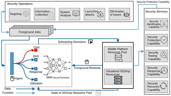 As shown in Figure 3, two types of arrows are used to indicate the data transmitted and the functions represented. Cost marked in red is the main optimization objective. The SDSmp control plane schedules the foreground jobs from the security application plane’s security operations. First, the application management module cleanses and categorizes them into different job types. Agents in the resource scheduling module coordinate with the resource pool management module to assign each job to an Smp resource in the resource pool of the most appropriate type. Smp resources provide automized security services that provide appropriate security capabilities to foreground jobs. The final job is executed in the encapsulated, mapped security infrastructure layer.