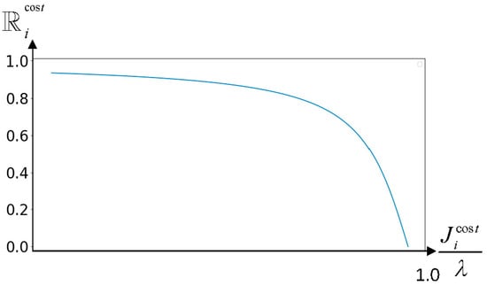 where is the job execution cost and is the hyperparameter representing the maximum cost, , of the job. As shown in Figure 4, the image of the reward function, , decreases nonlinearly with the job cost, . When the cost tends to 0, the user is more tolerant of the cost change, and changes very slowly. When cost tends to be maximum, tends to be 1, and the user can hardly accept the high price, and drops to 0 quickly.