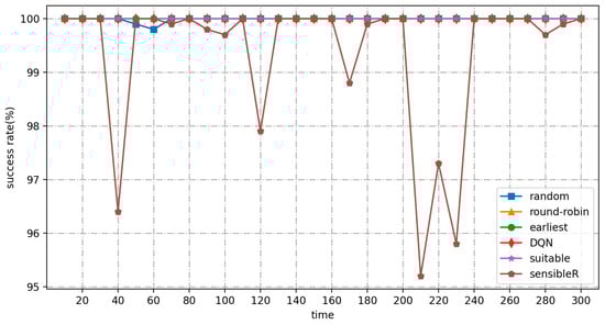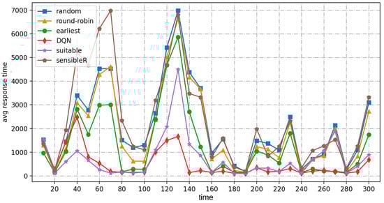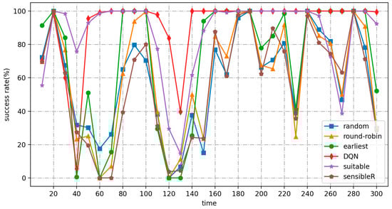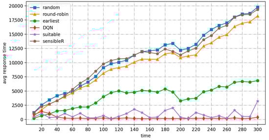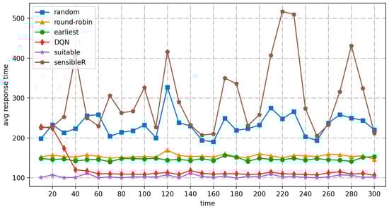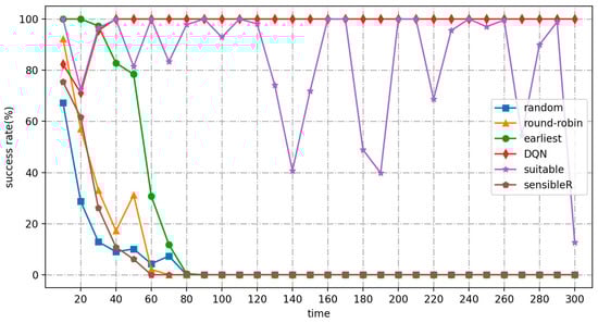 As shown in Figure 12 and Figure 13, the average response times of random, round-robin, and earliest continue to increase until the system fails. Their QoS satisfiers are all close to 0 after 80 s. While suitable stays up and running in high-frequency workload mode, the average response time is almost always below 2500 ms. The QoS satisfiers are almost always above 40%, but fluctuate widely. The DQN algorithm, on the other hand, always performs at a very high level, with QoS satisfaction ranging from 70% to 95% for the first 30 s, but close to 100% for the rest of the time, and the training time to adapt to the new workload mode is reduced to 20 s.