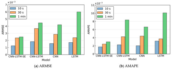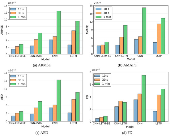 As the time interval increased, the prediction effect of CNN-LSTM-SE, CNN-LSTM, CNN and LSTM became increasingly inaccurate. When the time interval was 10 s, in comparison with other models, the CNN model had the worst prediction effect. For the CNN model, the evaluation index values were 0.0042, 0.0055, 0.0050, 0.0356 and 0.5037, respectively. It is easy to see that the CNN model had difficulty capturing the correlation of the trajectory data at the 10 s time interval, which seriously impacted the prediction effect. The CNN-LSTM-SE method improved the model’s ability to extract features by introducing the squeeze-and-excitation network, and the LSTM module was able to effectively capture temporal dependencies, which greatly improved its prediction effect.
