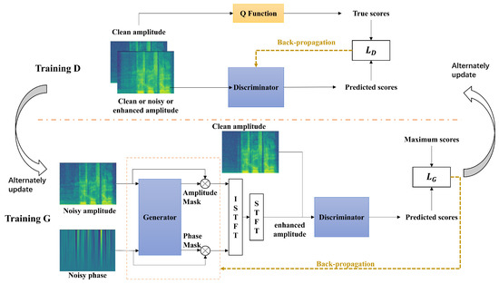 Our full experiments were constructed in Pytorch, based on the Speechbrain toolkit [56]. All speech samples in the experiments were resampled to 16 kHz. The amplitude spectrogram and phase spectrogram were obtained by STFT, which was computed using Hamming windows with a window length of 32 ms, a hop length of 16 ms, and FFT points set to 512. The network models were all optimised using Adam [57]. We set as 0.9 and as 0.999, the learning rates of G and D are set to 0.0001 and 0.0005. There are four phases of training in each of our epochs. Of these, the first three training phases are for D. The following is a brief description of the training process for D and G.
