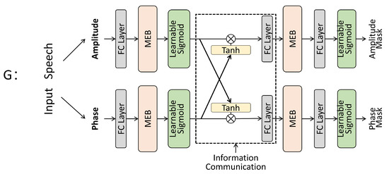 Our basic idea is to distinguish between the prediction of amplitude and phase, and perform enhancement through two parallel streams. These two streams can be denoted by and respectively, and their main structure is similar. We first complete the integration of the input data by means of a fully connected (FC) layer of 256 channels. Afterwards the Mask Estimated Blocks (MEB) module is connected to perform the initial feature extraction operation. We need two such feature extraction operations to complete the final mask estimation. In order to avoid oversize values affecting the training process, we introduced the Learnable Sigmoid layer to complete the truncation of the data [51]. The mathematical representation is shown in Equation (1).
