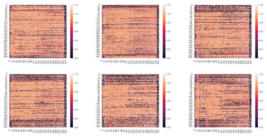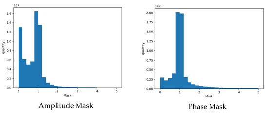 where is a learnable parameter, it will vary depending on the frequency band of the training data. On the other hand, can be configured with a variety of truncation intervals, which is the range of values for our Mask. In most of the experiments, masks are typically truncated between 0 and 1, but in the superposition of speech and noise, the problem of inverse phase extinction can easily arise. Therefore, the amplitude and phase of the noise may not necessarily be much higher than that of pure speech (i.e., it is possible that the value of pure speech is higher than that of the noisy signal). Meanwhile, for the phase, most of the phase mask does not produce many variations, and the phase wrapping problem created by a certain degree of phase amplification just compensates for the lack of negative values of our Mask. It is able to meet the needs of a small portion of the phase that needs to change significantly. In order to determine the value of , we randomly selected 1200 sets of speech data from the train set and the test set, each containing the noisy speech and the corresponding clean speech. We divided them to obtain the standard replication and phase Mask, and plotted the distribution histograms separately, as shown in the following Figure 3. Accordingly, we chose to set to 1.2, the interval of 0–1.2 can contain the vast majority of the data in it. In addition, inspired by [52], we pre-set the lower limit of mask to 0.05 before applying it to the spectrogram to avoid musical noise.