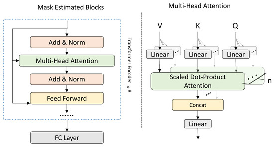 In both Stream A and Stream P, the main operation is handled by Mask Estimated Blocks, whose main function is to extract features from the amplitude or phase spectrogram. We have chosen to use the Transformer to perform this function, as its unique multi-head attention mechanism is better able to capture the dependencies in the speech information. The basic Transformer is a codec structure, but we only need to perform feature extraction on the spectrogram to get the estimated mask. Instead of improving the results, the decoder module would make the consumption of computational resources increase significantly. Therefore, we decided to use only Encoder to complete the construction of the MEB module. As shown in Figure 4, the left side shows the basic structure of a MEB module, which consists of eight Transformer encoders and a fully connected layer of 257 nodes. We set a Dropout of 0.1 for each encoder in our experiments and set the residual connectivity and normalization layers before Multi-Head Attention and Feed Forward, an operation that improves the performance and stability of the training. The structure of multi-head attention is shown on the right, which is also consistent with the structure of the base Transformer. We set n to 16 in the figure, indicating the number of heads. The Feed Forward layer is composed of a linear layer and a LeakyReLU layer, each with 512 nodes.