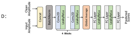 Our discriminator guides the generator by giving a quality-aware score for the input speech, and it only needs to model an evaluation metric that can be implemented by simple feature extraction. The structure is shown in Figure 5. Usually, the discriminator requires two inputs, namely the amplitude spectrogram of the speech being scored and the amplitude spectrogram of the target speech. We need to concatenate them together first, and standardize the data through the BatchNorm layer. Here we set the momentum parameter to 0.01. The body of the discriminator is a CNN with four two-dimensional convolutional layers. The number of channels in each layer is 15, and the kernel size is 5 × 5. A global averaging pooling layer was added to handle different lengths of speech input. This resulted in a fixed dimensionality of 15 for the features (i.e., the number of feature mappings in the previous layer). Three FC layers were added. The first two layers had 50 and 10 linear nodes respectively, and a LeakyReLu layer was applied after each layer for activation (the of LeakyReLu was set to 0.3). The final layer has only one linear node for outputting the final prediction score. We applied spectral normalization with 1-Lipschitz continuity [53] to all layers used in the discriminator to stabilize the training process, and we trained D as a smooth functional model that estimates the amplitude spectrogram to derive the corresponding scores. Our discriminator can be set up with different evaluation metrics to accomplish different optimisation goals. Here, we tried two main evaluation metrics, PESQ and STOI, which take full account of human auditory perception and are closer to subjective test results in most cases.
