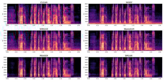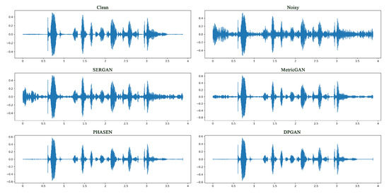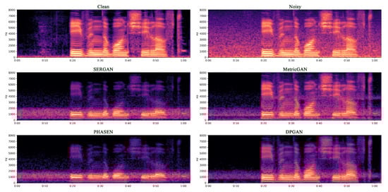 To analyze the performance of the system, we tried to reproduce some of the classical speech enhancement algorithms, including SEGAN [42], iSEGAN, DSEGAN [62], MetricGAN [18], HiFiGAN [44], MetricGAN+ [51], and PHASEN [10]. iSEGAN and DSEGAN are extensions of SEGAN training, which connect multiple generators in order to enhance the enhancement effect. While HiFiGAN and MetricGAN+ are the networks with better performance among different repair methods. Meanwhile, since Voicebank+DEMAND has been limited to a training set, a validation set, and a test set, we cite some papers based on this dataset (including SERGAN [43],CP-GAN [63],MMSE-GAN [64] and the recently published PGGAN [65] and DCCRGAN [66]). Furthermore, we have selected some of the better performing and classical non-GAN methods for comparison, including DC-U-Net [27] and Wave-U-Net [67], both of which are built on the U-Net architecture, and S-DCCRN [68] using the plural domain. (For the purpose of fair and representative comparisons, all of these papers use training data from the original Voicebank+DEMAND dataset for training). Table 1 shows the comparison results with the above baseline, where DPGAN(S) and DPGAN(P) are the results of our discriminator’s fits to the STOI and PESQ, respectively. As can be seen, compared to most GANs, our method has a breakthrough performance lead in both the main evaluation metric PESQ, improving to 3.32, and some degree of improvement in other metrics, which demonstrates the effectiveness of dual-stream GAN with phase awareness in the field of speech enhancement, and the feasibility of using only the Transformer encoder to build the generator. At the same time, we note that the CSIG and CBAK scores in some of the models are slightly higher than ours, because we set the lower limit of Mask to 0.05, which makes the speech more natural-sounding [51]. However, our repair for phase also introduces new noise to some extent, so it may cause a decrease in these two metrics. We also show multiple sets of restoration effects in the subsequent qualitative analysis, from which we can see that our restoration effect is improved compared to some other methods. As for the decrease in these two indicators. We also made the following attempts. We also experimented with truncating Mask to 0-1, which proved to improve both metrics to some extent, but at the same time reduced the performance of the main optimization metric, PESQ. Moreover, the analysis of the actual enhanced audio shows that the slight reduction of these two metrics has an acceptable impact on the final restoration results. We have also tried to use CBAK, CSIG, and COVL to be the main optimization metrics, but more experiments show that the improvement of these data tends to cause a large decrease in the remaining metrics and affects the the final enhancement effect. In addition, our discriminator is currently trained to fit only PESQ and STOI. In general, DPGAN is able to provide some enhancements to the current SOTA system.
