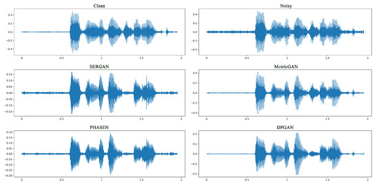A comparative waveform plot of the enhancement effect of low-frequency noise at higher signal-to-noise ratios is shown. From left to right and top to bottom are pure speech, noisy speech, and the enhanced effects of SERGAN, MetricGAN, PHASEN and DPGAN, respectively.