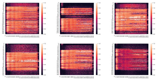 Phase enhancement masks for different noise speech. Lighter colors represent larger values.