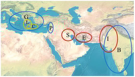The approximate locations of the eight ancient scripts. The legend is as follows: B—Brahmi, C—Cretan hieroglyphs, E—Elamite, G—Greek, I—Indus Valley, L -Linear B, P—Phoenician, and S—Sumerian. Red indicates the three earliest scripts, orange the middle two scripts, and blue the three most recent of the eight ancient scripts. Source of background map: https://upload.wikimedia.org/wikipedia/commons/f/f3/Map_of_Eurasia.png (accessed on 2 February 2023).