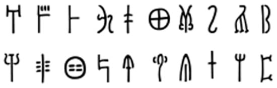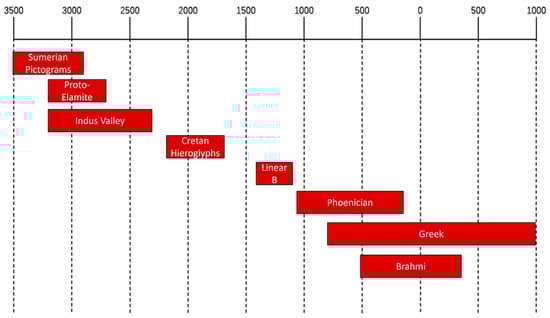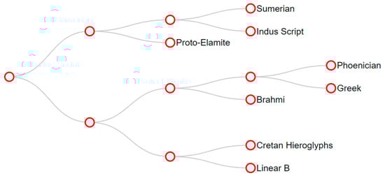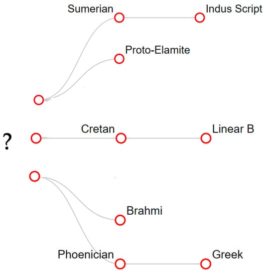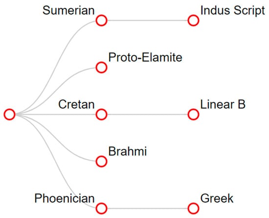 A weakness of these proposals is the large time gap between the latest Indus Valley and the earliest Brahmi script inscriptions, which are likely from the time of Ashoka’s Empire in the 3rd century BCE, although some authors assume around 500 BCE for the beginning of this script. Salomon [30] has proposed a Phoenician alphabet origin of the Brahmi script. This latter proposal agrees more closely with our proposal in Figure 16, where Brahmi and Phoenician are placed in the same branch of the script evolution tree.