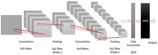 Python and TensorFlow together with a Keras wrapper were used to build neural networks with different accuracy levels depending on the learned script. We used a convolutional neural network (CNN) architecture similar to the architecture of LeNet [19], though with some changes that are illustrated below in Figure 11. The primary difference between LeNet and our network is that a support vector machine (SVM) was added at the end. The addition of an SVM was also effectively used in [20].