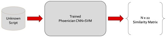 Figure 12 shows the scheme according to which the trained and validated classifiers for the eight scripts were used to test the similarity of any pair of scripts. Figure 12 specifically shows how the N signs of any one of the seven other scripts (called the ‘unknown script’ in the diagram) can be compared with the 22 letters of the Phoenician alphabet.