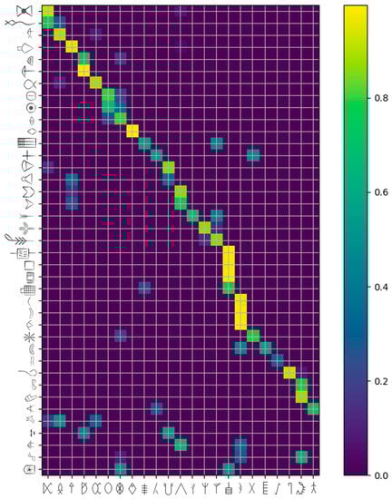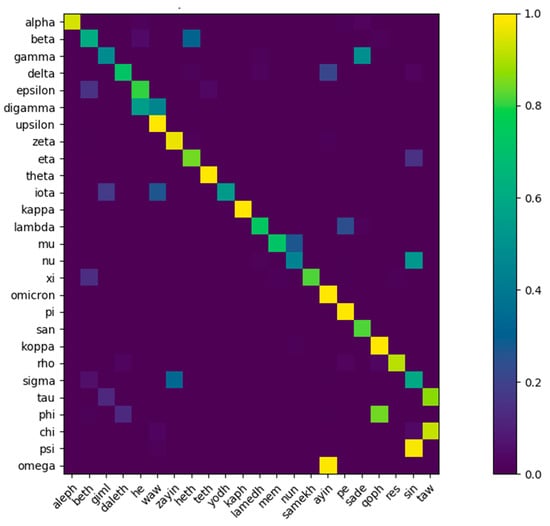 There are some even more advanced character-recognition algorithms beyond our convolutional neural networks. However, the convolutional neural network we used was already able to accurate perform character recognition. The main problem addressed in this paper was the comparison of characters from different scripts, rather than character recognition within a single script. The character comparison also gave high similarity measures for related signs, as is shown in the heat maps of Figure 14, Figure 15 and Figure 16. Low character comparison values were obtained only when the signs were not related to each other.