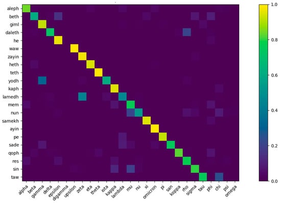 We can validate Phoenician as the ancestor of Greek by passing the letter of the Greek alphabet into the classifier that was trained to recognize the Phoenician alphabet, or vice versa. Figure 13 and Figure 14 show the heatmaps for the Phoenician and the Greek alphabets. The heatmaps were generated from the similarity matrices and show high similarities along the main diagonal. This proves that there is an almost perfect one-to-one function between the letters of the Phoenician and Greek alphabets. Moreover, this mapping matches our original expectations.