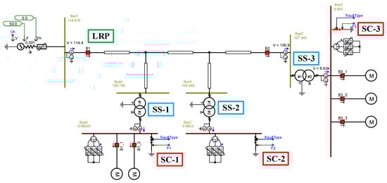 PSCAD model of a 110/10 kV network section (LRP – long-range redundancy protection; SS-1, SS-2, SS-3—substations; SC-1, SC-2, SC-3—short-circuit currents points).