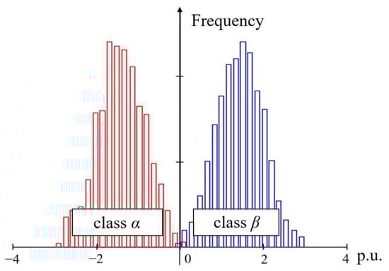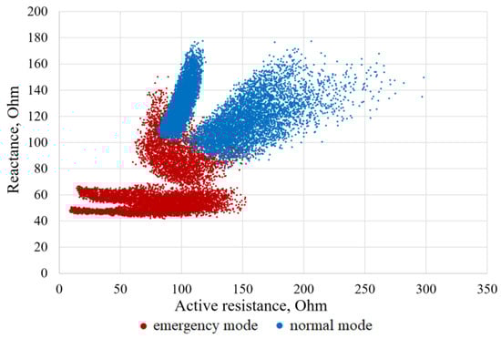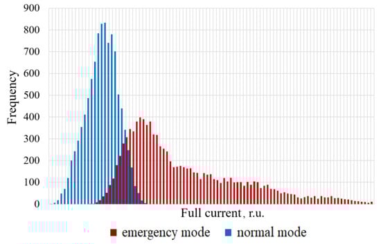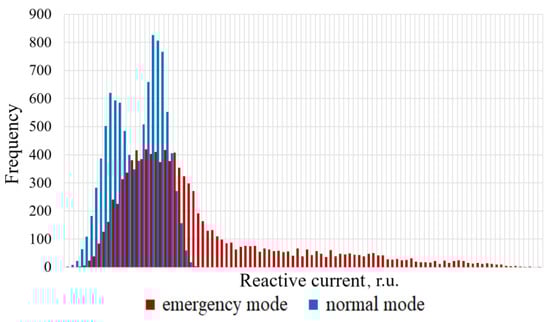 As a result of the simulation, the complex values of phase currents () and voltages () are calculated at times of normal operation and various SC (emergency modes). Having received the complexes of currents and voltages, the values can be easily determined by the following informative parameters for the RPA operation: active and reactive current, power and resistance, phase, emergency components of active and reactive current, positive and negative sequence currents, and full current module [57]. It was determined that not one of the features by itself gives an unambiguous separation of the two training samples among themselves. As an example, this is shown in Figure 2, Figure 3 and Figure 4. The current values in Figure 2 and Figure 3 are presented in relative units (r.u.).