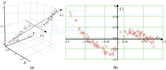 Despite the fact that the sample was initially set in three-dimensional space, Figure 5 shows that the points practically lie in the same plane, which means that their description by three coordinates is redundant. The projection of the sample onto the plane specified by the axes C1 and C2 preserves the internal structure of the initial data with minimal losses. However, due to its smaller dimension, it requires less storage space and is easier to analyze using computer technology.
