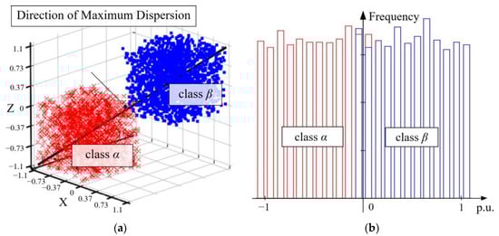 Based on the criterion presented above (Equation (8)), the Fisher linear discriminant is determined. The direction of the new W component onto which the samples are projected maximizes the J(W) function. In the W direction, the projections of the initial samples x1, …, xn are maximally removed from each other.