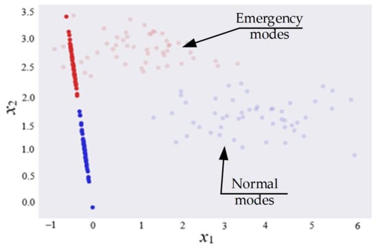 Thus, applying this method on the sample presented above, we obtain the following result, which is shown in Figure 9. Areas of emergency modes of features x1 and x2 and their linear combination according to the FLD method are shown in red. Areas of normal modes of features x1 and x2 and their linear combination according to the FLD method are shown in blue.