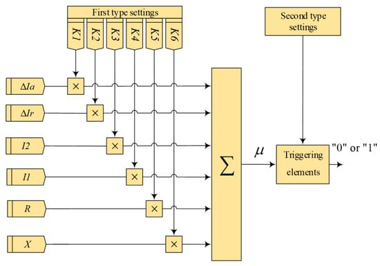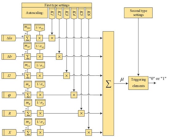Structural schemes of the triggering elements of the considered methods are similar and provide for two types of settings [65,66]. The first type of setting is used to obtain a generalized feature μ by weighted summation. This involves multiplying each initial feature by its pre-obtained weight coefficients and summing up with each other. The second type of setting is used to make a decision on the operation of relay protection by comparing the generated generalized feature with the setting. This happens on the principle of simple current protection. At the output of the triggering element, a binary signal is generated for launch (“1”) or not launch (“0”) of the relay protection.