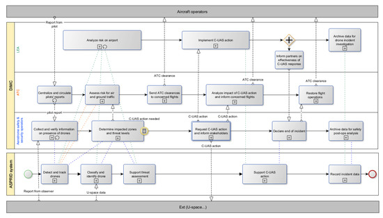 Within the context of major airports, the ASPRID system should provide 24/7 situational awareness to all users by uninterrupted monitoring of the airport environment, making the tactical phase a rolling process that is always active. Figure 1 shows the flowchart for the main subprocesses of the tactical phase, using the Business Process Model and Notation (BPMN) [29]. It is divided into four swimlanes, representing the following actors or responsibilities: the DIMC, the ASPRID system (including ASPRID human roles that are detailed in Section 3.2), aircraft operators in the jurisdiction of the airport or air traffic control (ATC), and other external actors such as U-space. The DIMC lane itself is subdivided into three sub-lanes to distinguish actions realized within the DIMC by the aerodrome’s safety and security operators, ATCOs and LEA. Boxes inside lanes represent activities under the responsibility of each actor, and plain arrows indicate the sequence of actions. Finally, dotted lines represent information exchanges between actors.